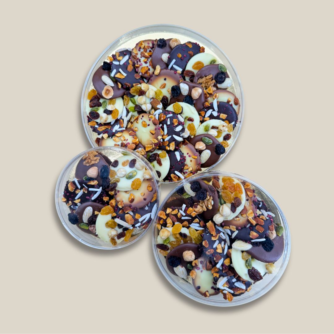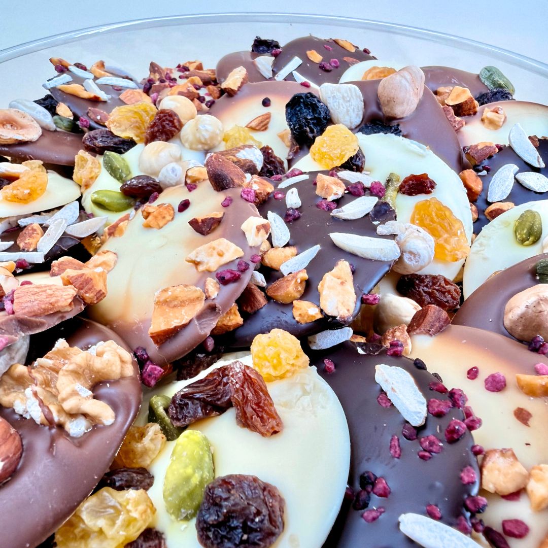 Fins palets de chocolat lait, blanc ou noir garnis de fruits secs et noix, amandes, noisettes et pistaches.